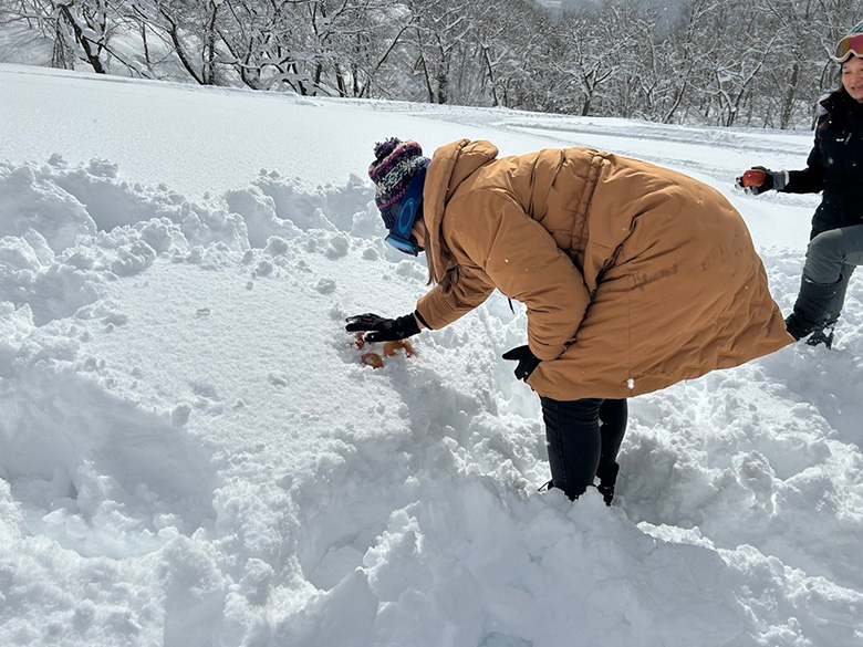 予め雪の中にりんごを埋めて、参加者が雪をかき分けりんごを掘り出す体験になっています。