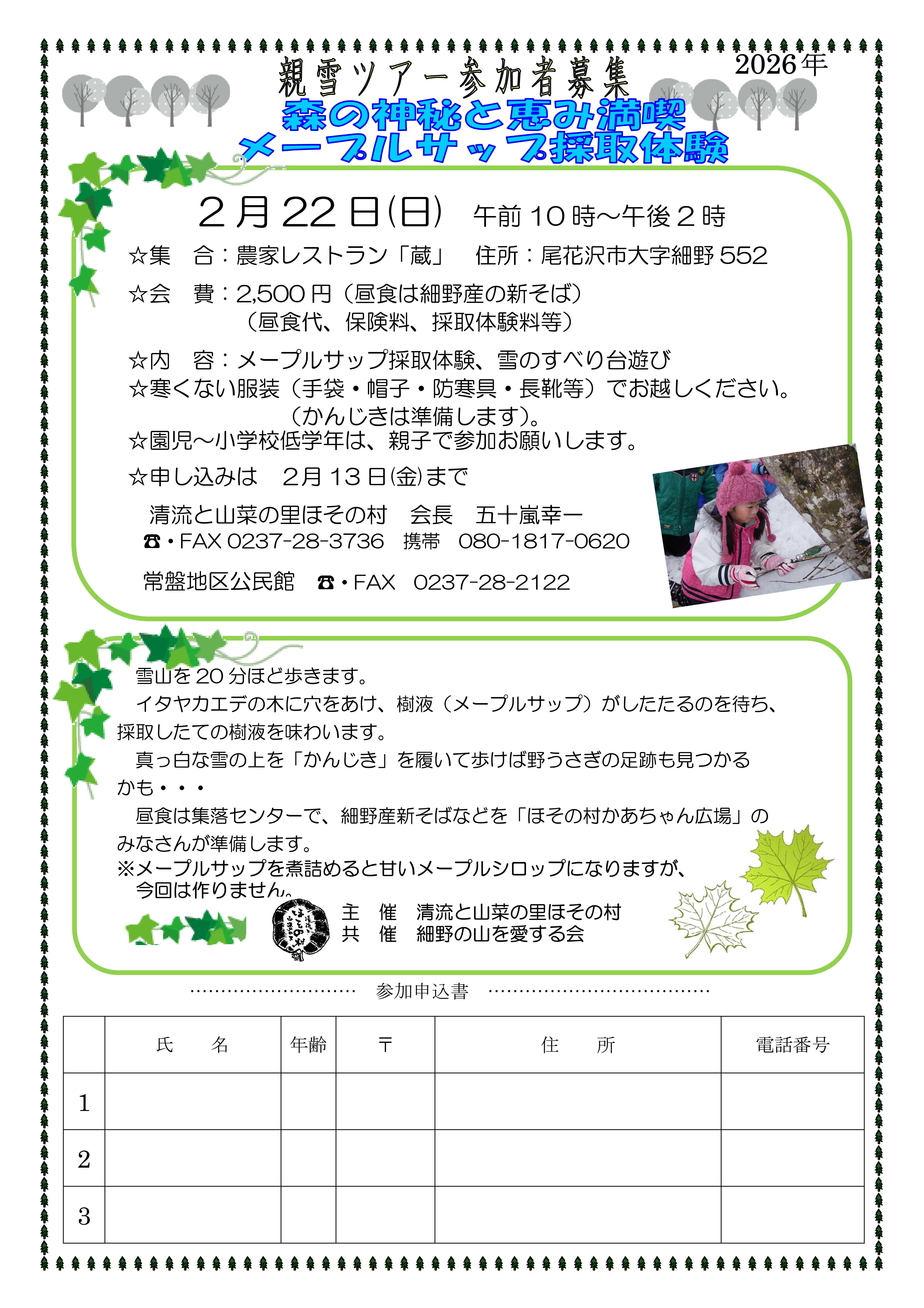 ◇ 会 費 2,500円(昼食代、保険料、採取体験料等)(昼食は細野産の新そば)