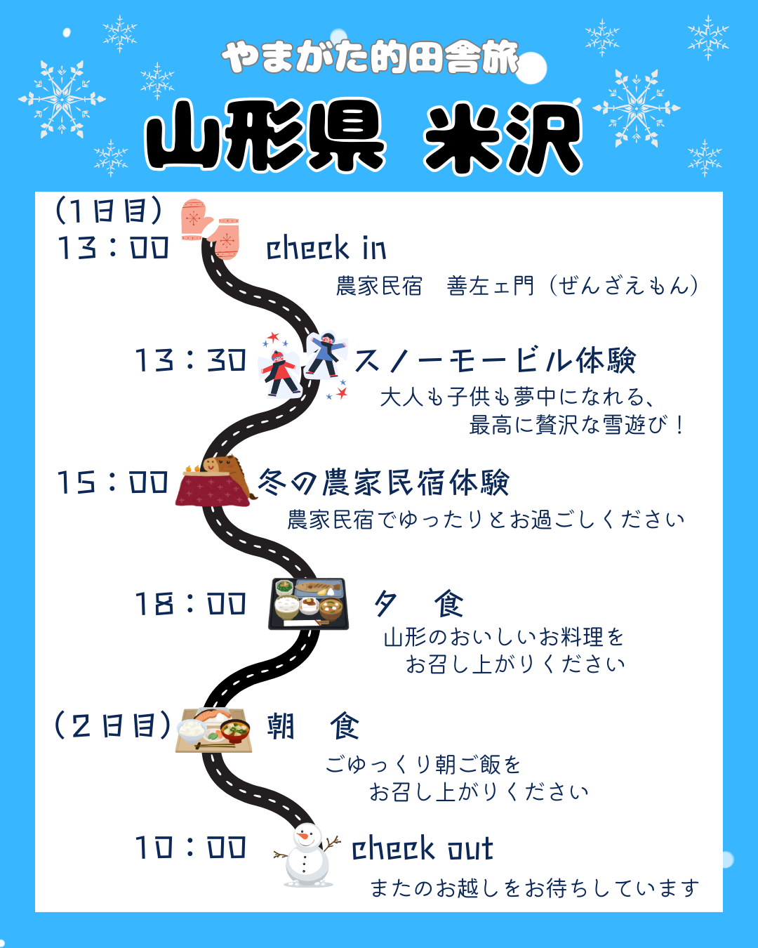農家民宿 善左エ門(TEL:0238-38-4156/090-3126-9789)まで直接ご連絡ください。