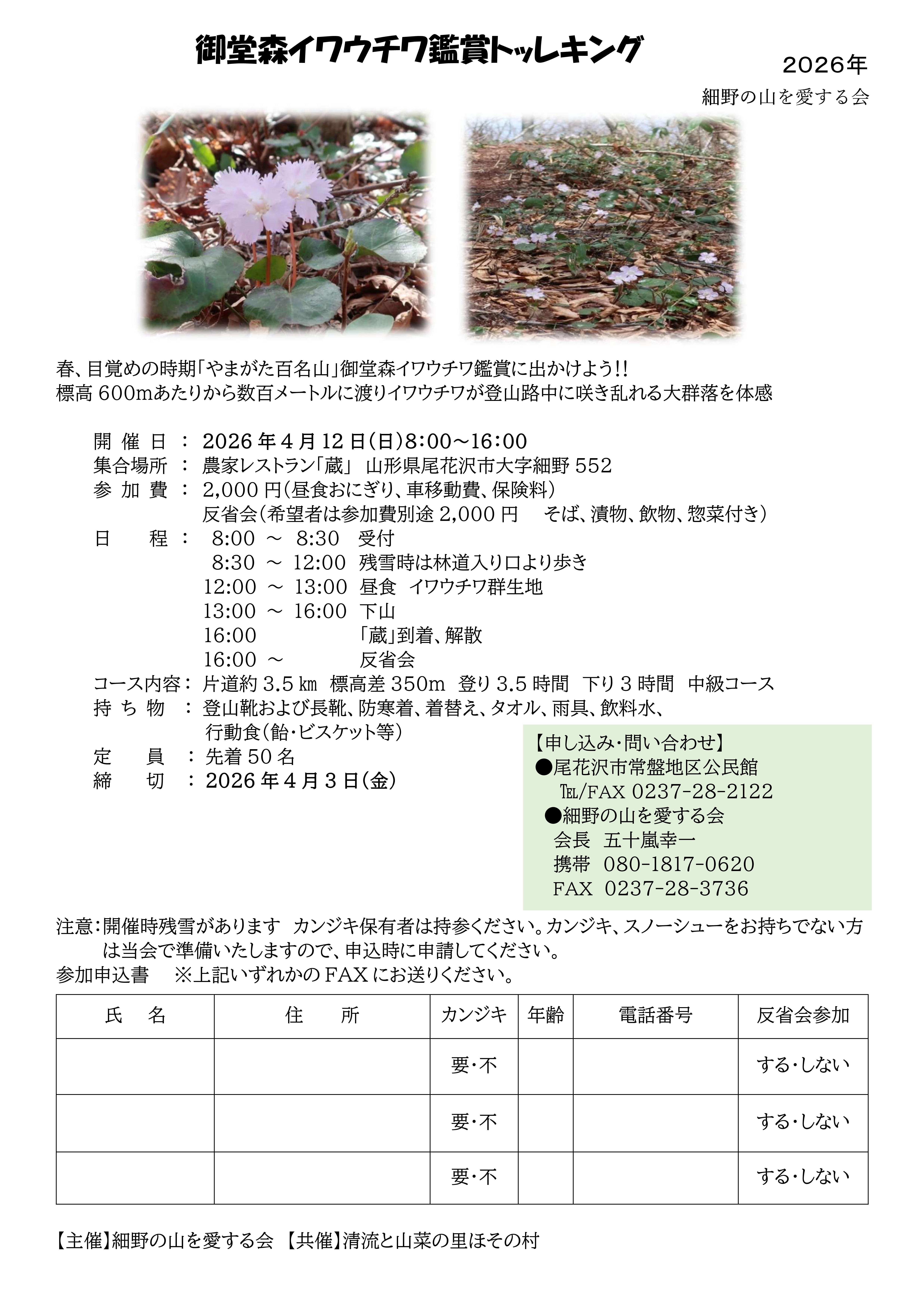 ◇ ご注意 開催時残雪があります。カンジキ保有者は持参、カンジキ、スノーシューズをお持ちで無い方は当会で準備しますので、申込時に申請をしてください。
