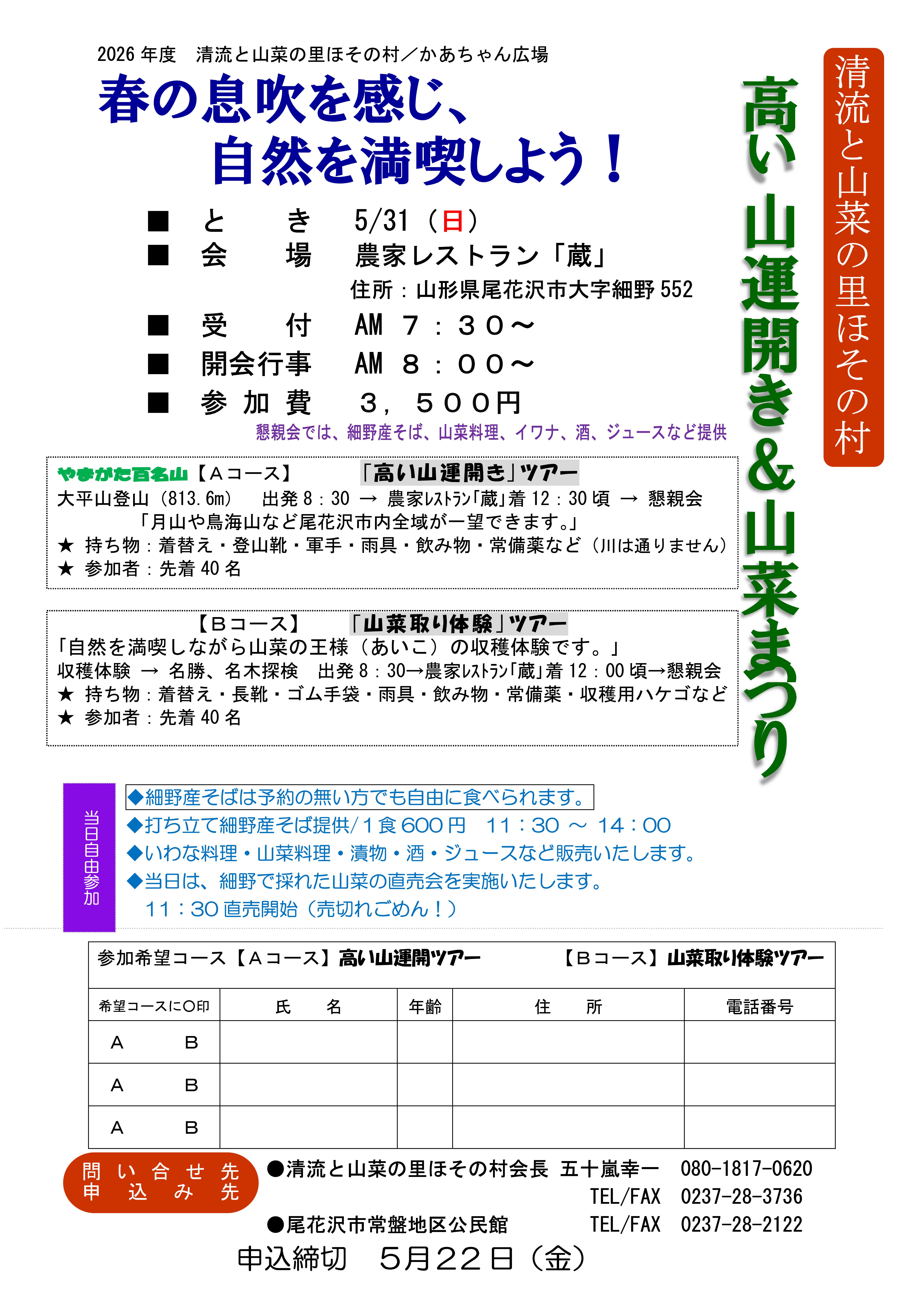 大平山登山と山菜の収穫体験をそれぞれ実施します。