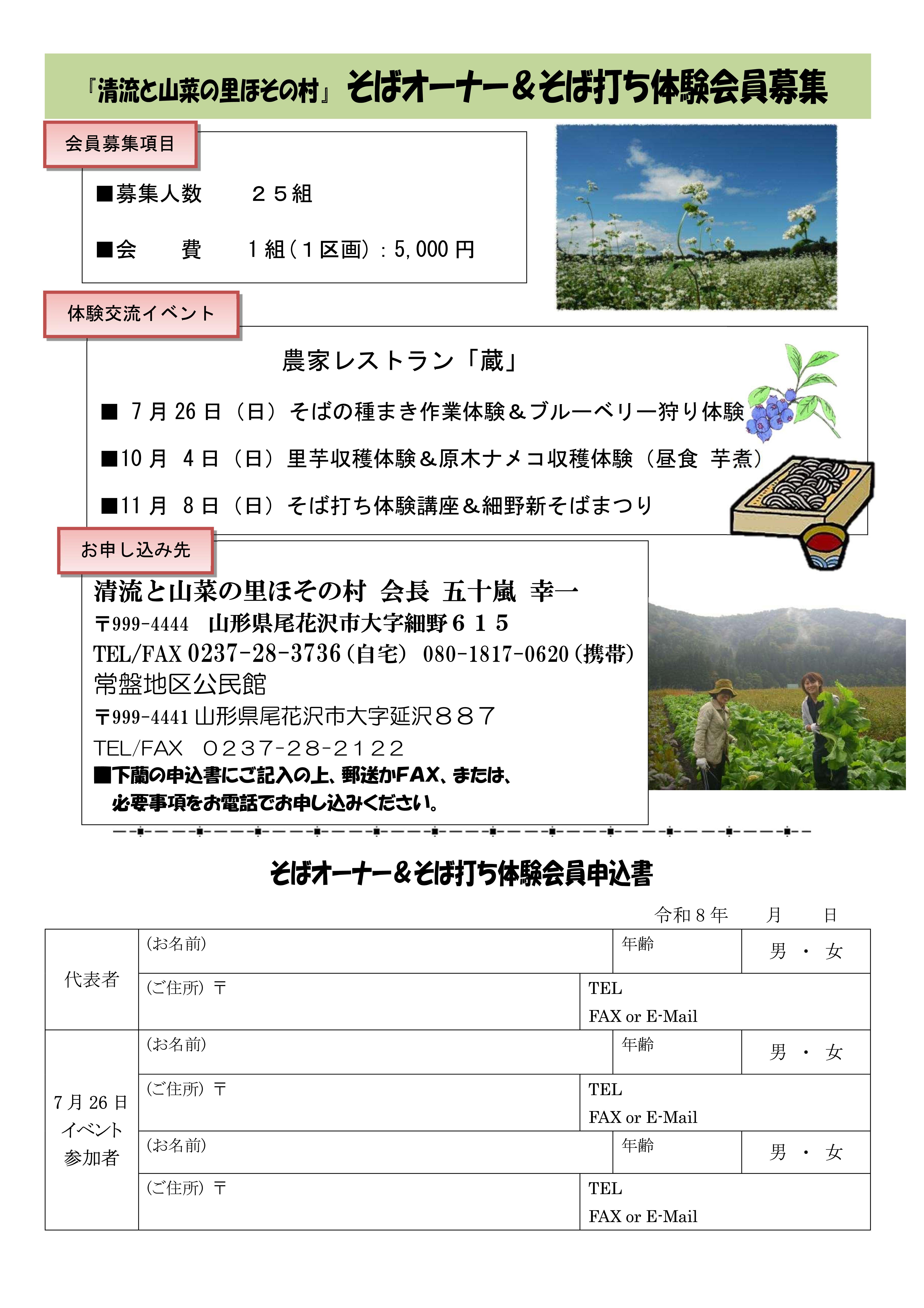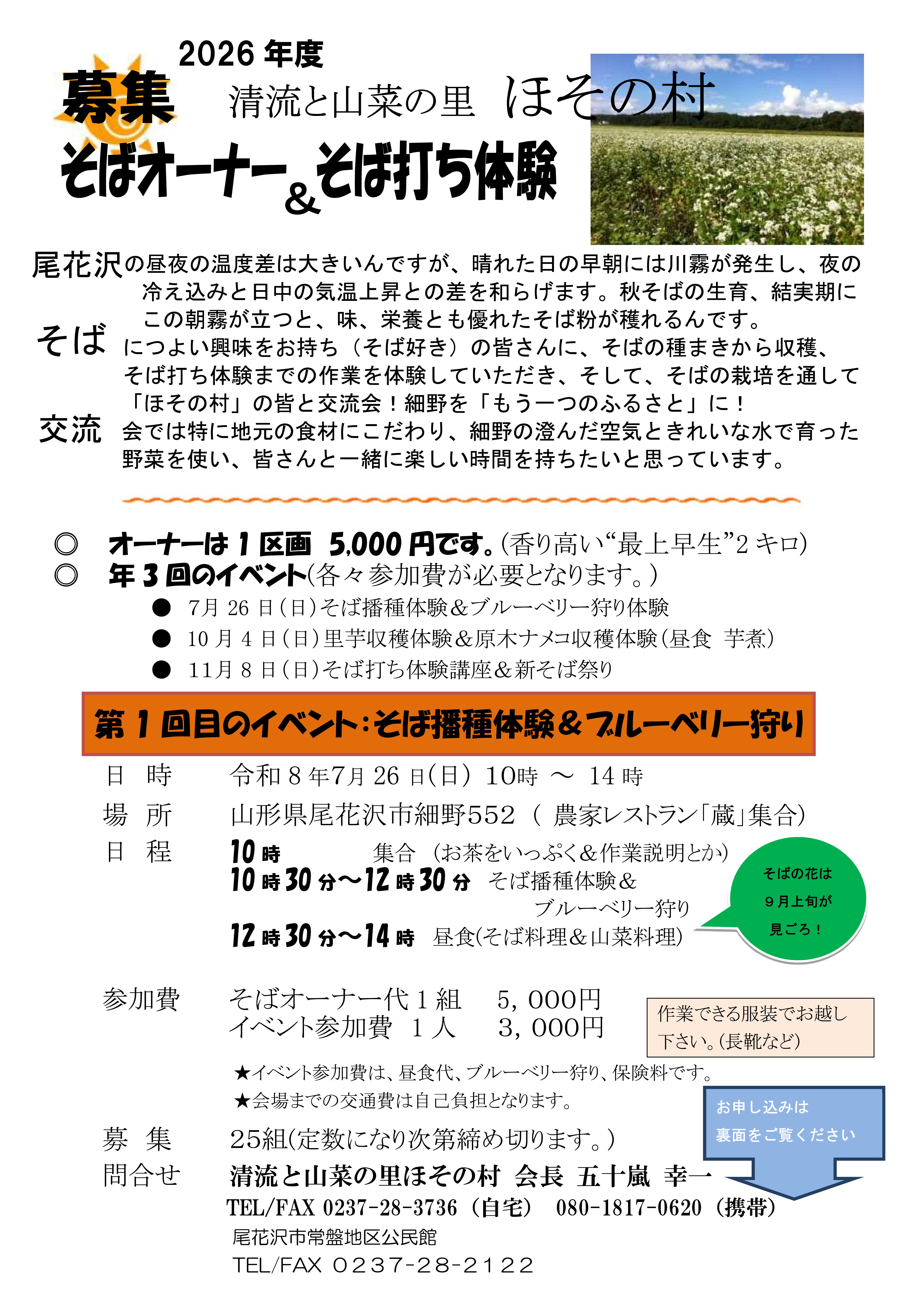 そばにつよい興味をお持ち(そば好き)の皆さんに、そばの種まきから収穫、そば打ち体験までの作業を体験していただき、そして、そばの栽培を通して「ほその村」の皆と交流会!細野を「もう一つのふるさと」に!