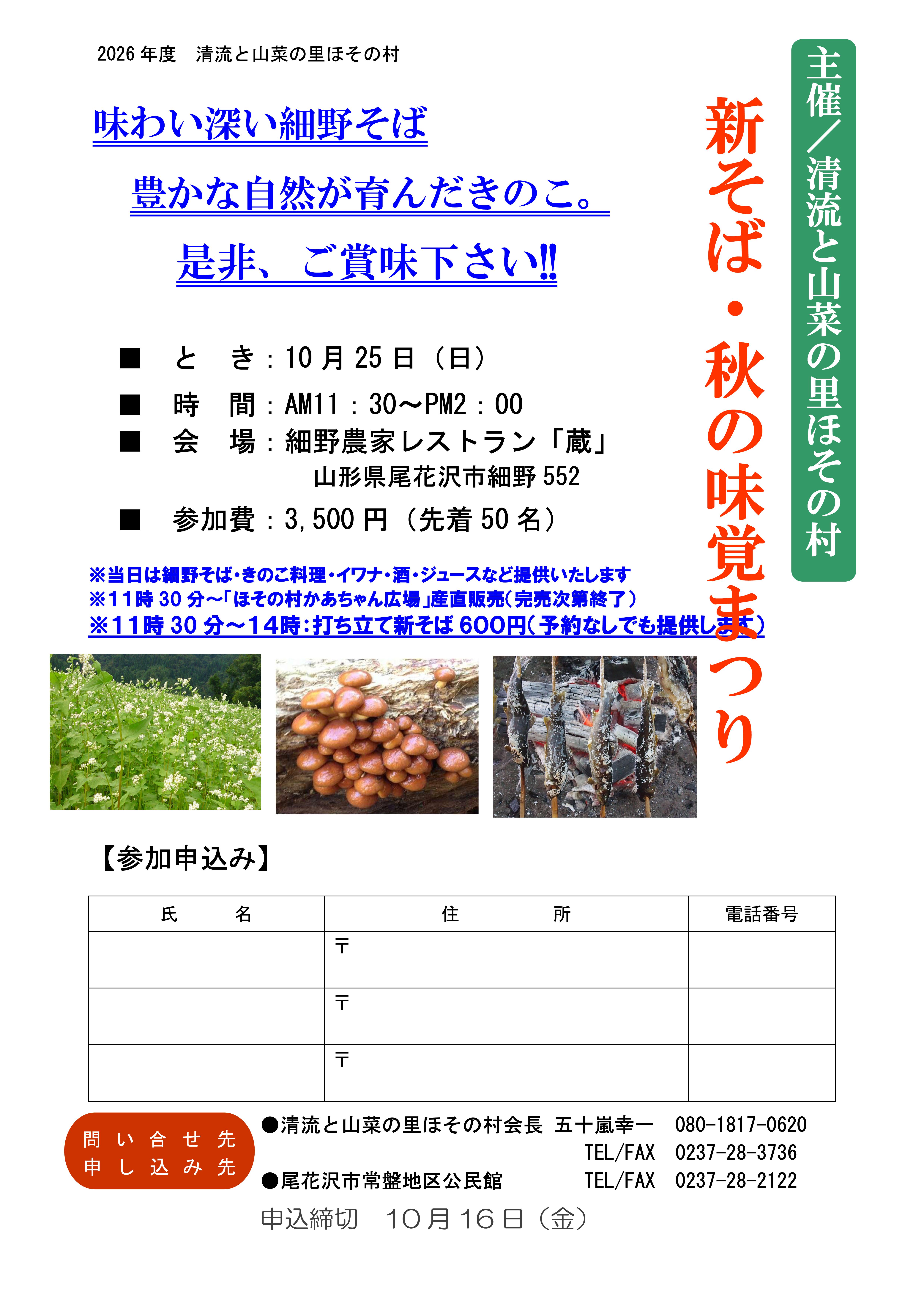 ◇ 参加費 3,500円 (細野そば・きのこ料理・イワナ・酒・ジュースなど提供予定)